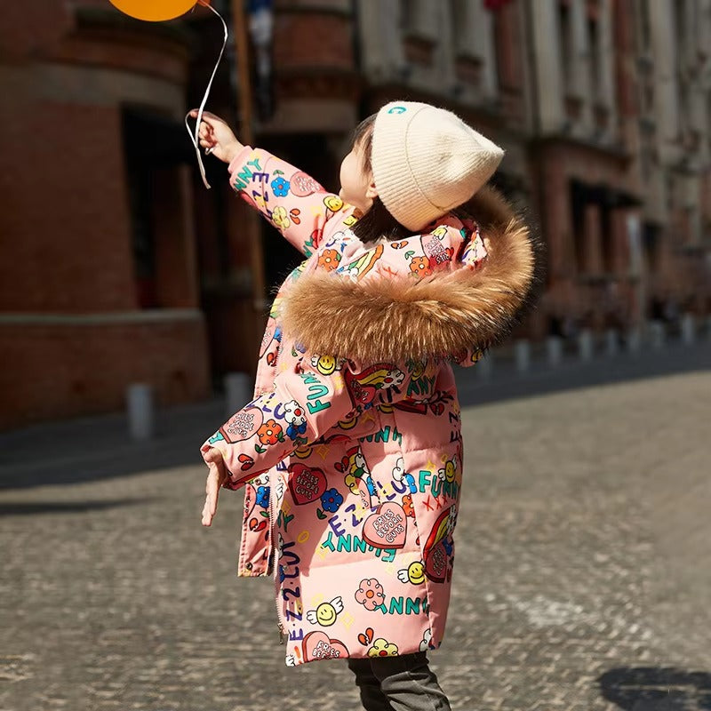 2023 Girls' Mid-Length Down Jacket – White Duck Down (Fox Fur Collar, Zipper, Winter)