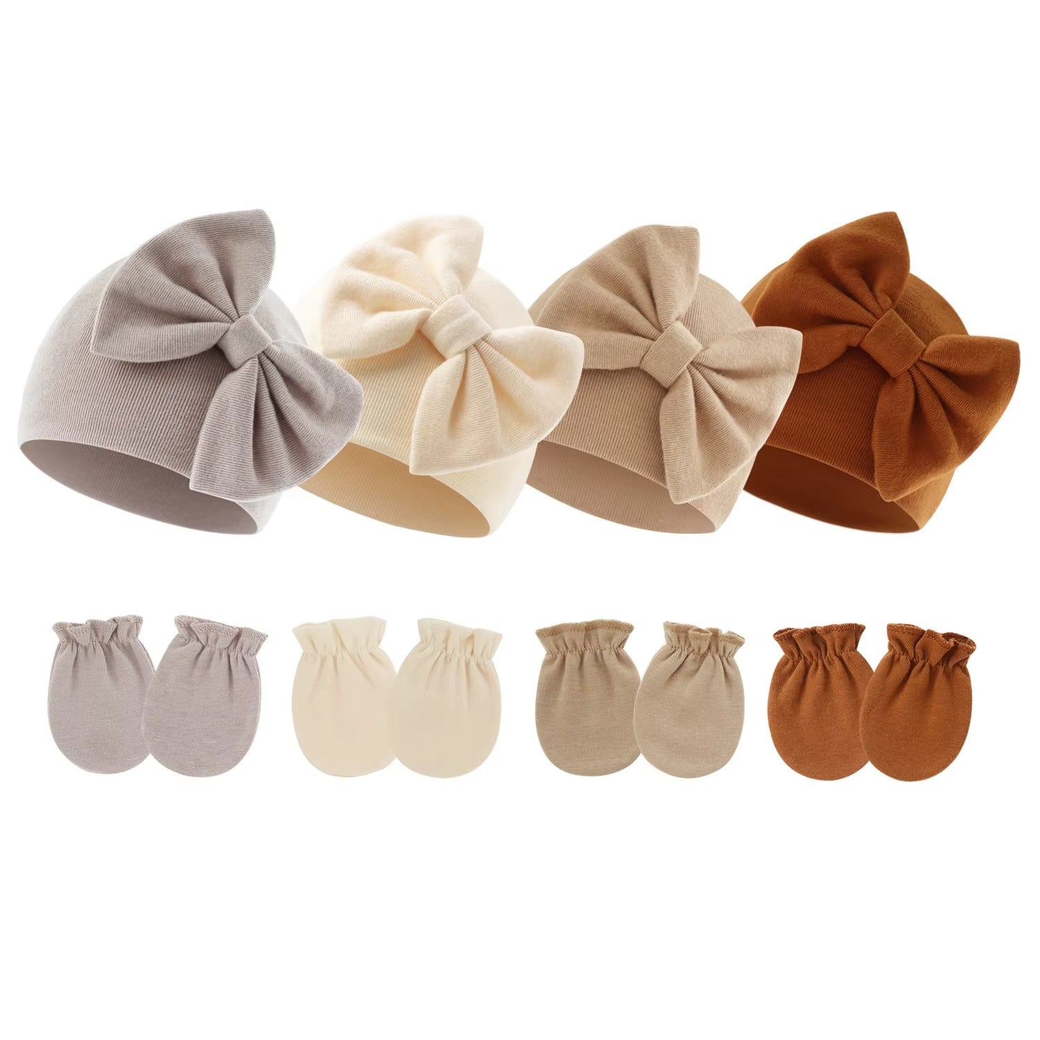 Newborns' Cute Hat & Glove Set – Bowknot, Candy-Colored (0-6M)